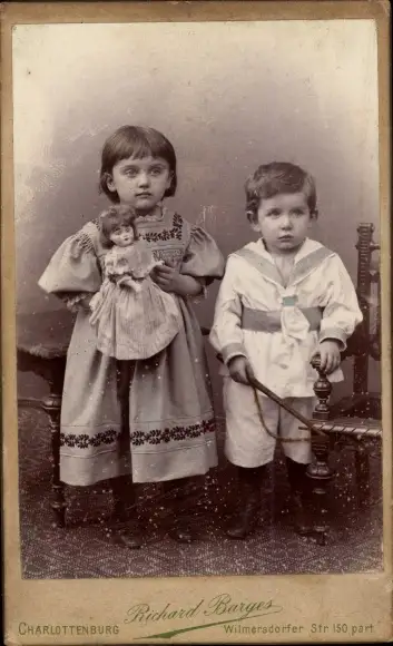 CdV Kinderportrait, Mädchen mit Puppe, Junge mit Kreiselpeitsche