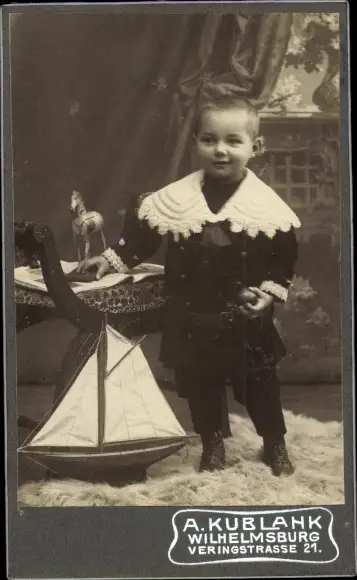 CdV Kinderportrait, kleiner Junge mit Modellboot