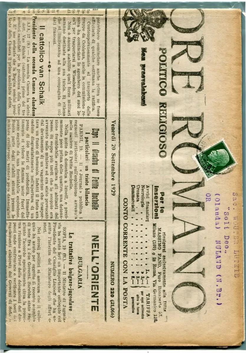 Osservatore Romano - Komplette Zeitung vom 30.9.1929 frankiert nach Holland verschickt mit Briefmarke aus Ce.t 25 Imperiale - Sehr guter Erhaltungszustand - Selten Cod. 691/11