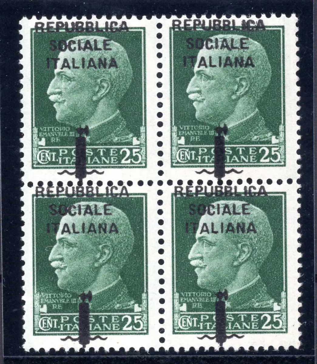 Cent. 25 Viertel Sorte verschobener Aufdruck Vollgummi - Cent. 25 n. 491pf Viertel mit stark verschobenem Aufdruck Band unten und Schriftzug Italienische Sozialrepublik oben - Uncommon Cod. 180/13