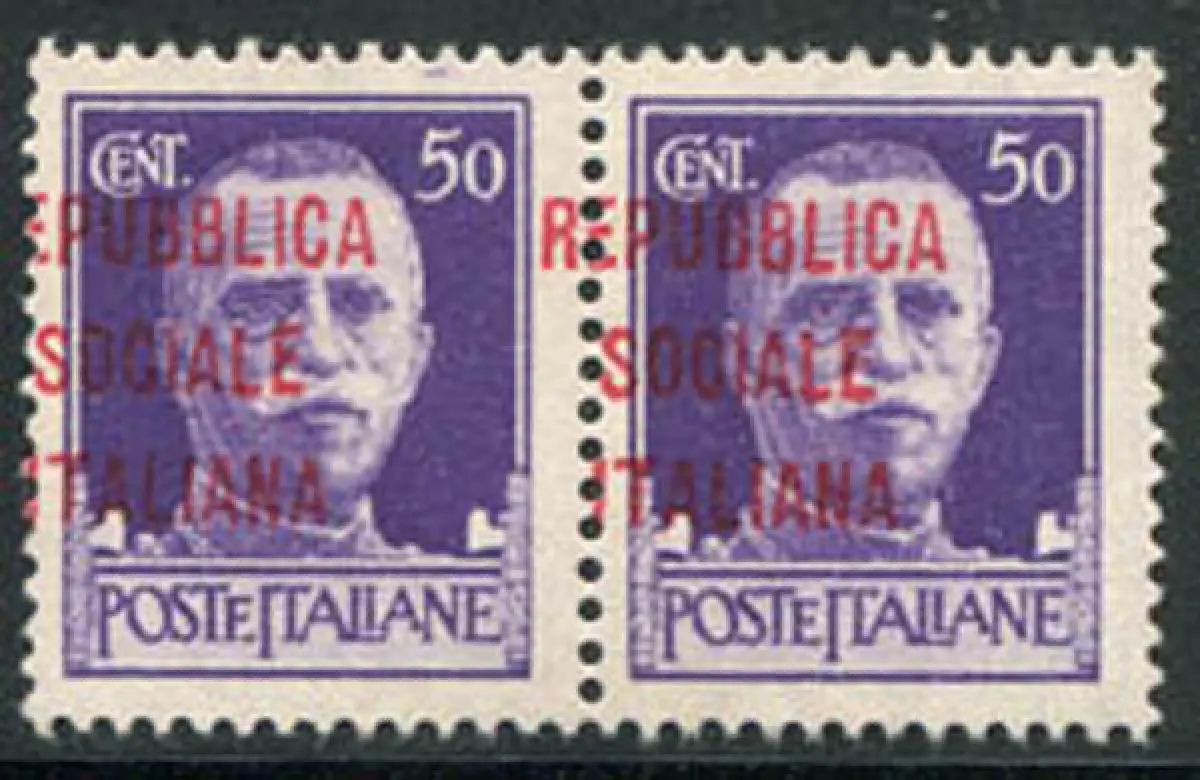 ** postfrisch - Cent. 50 Paar horizontal mit stark links verschobenem Aufdruck Epubblica R (Nr. 493pmab) mit dem rechten Exemplar aus der letzten senkrechten Reihe des Blattes ohne das R der Republik rechts - gebrauchte bekannte Sorte und andere unveröffentlichte Code 311/11