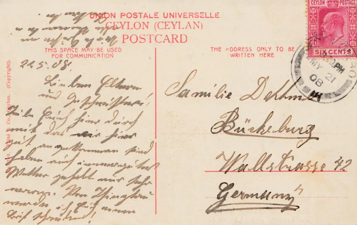 Ceylon: 1908: picture post card Colombo Pork Street to Bückleburg/Germany