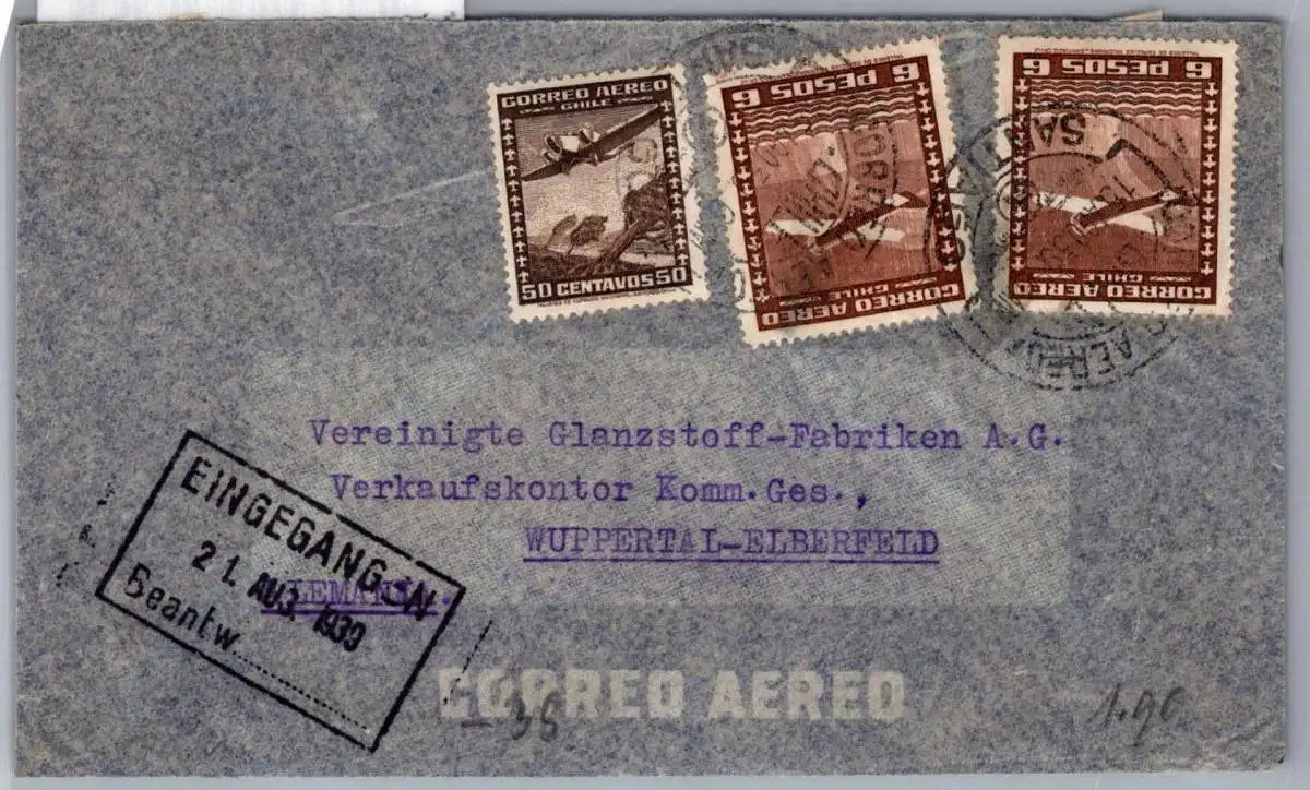 Luftpostbrief aus Santiago de Chile am 15.8.1939 nach Wuppertal Elberfeld gelaufen.