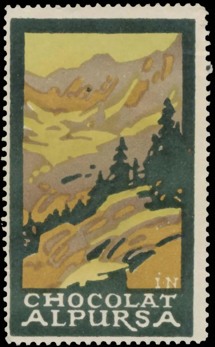 Schokolade, Berge, Größe/Zustand: 6x4 , Fehldruck, guter Zustand, Original alte Reklamemarke die seinerzeit für die Werbung benutzt wurde