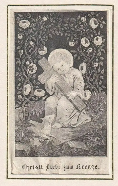 Bemerkungen: Eingerahmt von zwei Rosensträuchern ist das Christuskind mit dem Kreuz in seinen Armen zu sehen, vor ihm liegt ein Lamm.