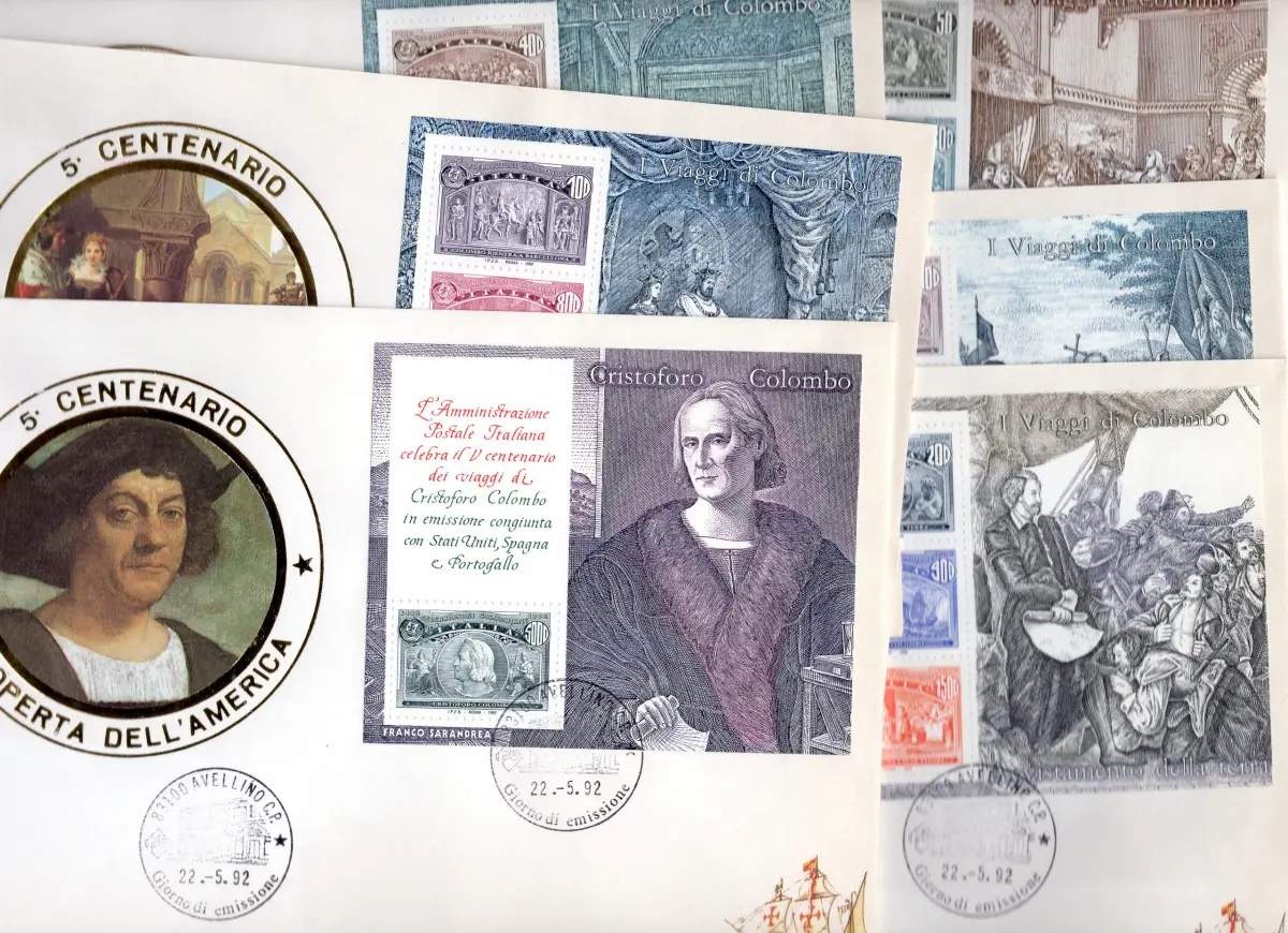 Die Serie der sechs Zettel zum 5. Hundertjahrfeier der Entdeckung Amerikas durch Christoph Kolumbus auf gereisten Umschlägen für eingeschriebene Ausgabe Rom - Cod. 1592/WEB