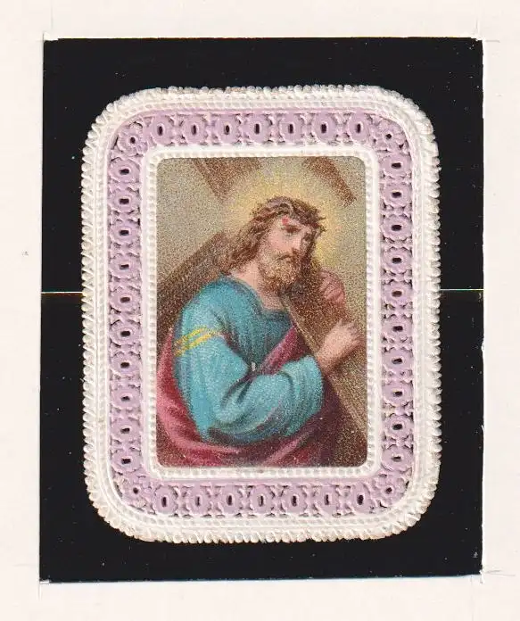 Bemerkungen: Die Chromolithographie zeigt die Kreuztragung Christi. Auf schwarz glänzendes Trägerpapier montiert.