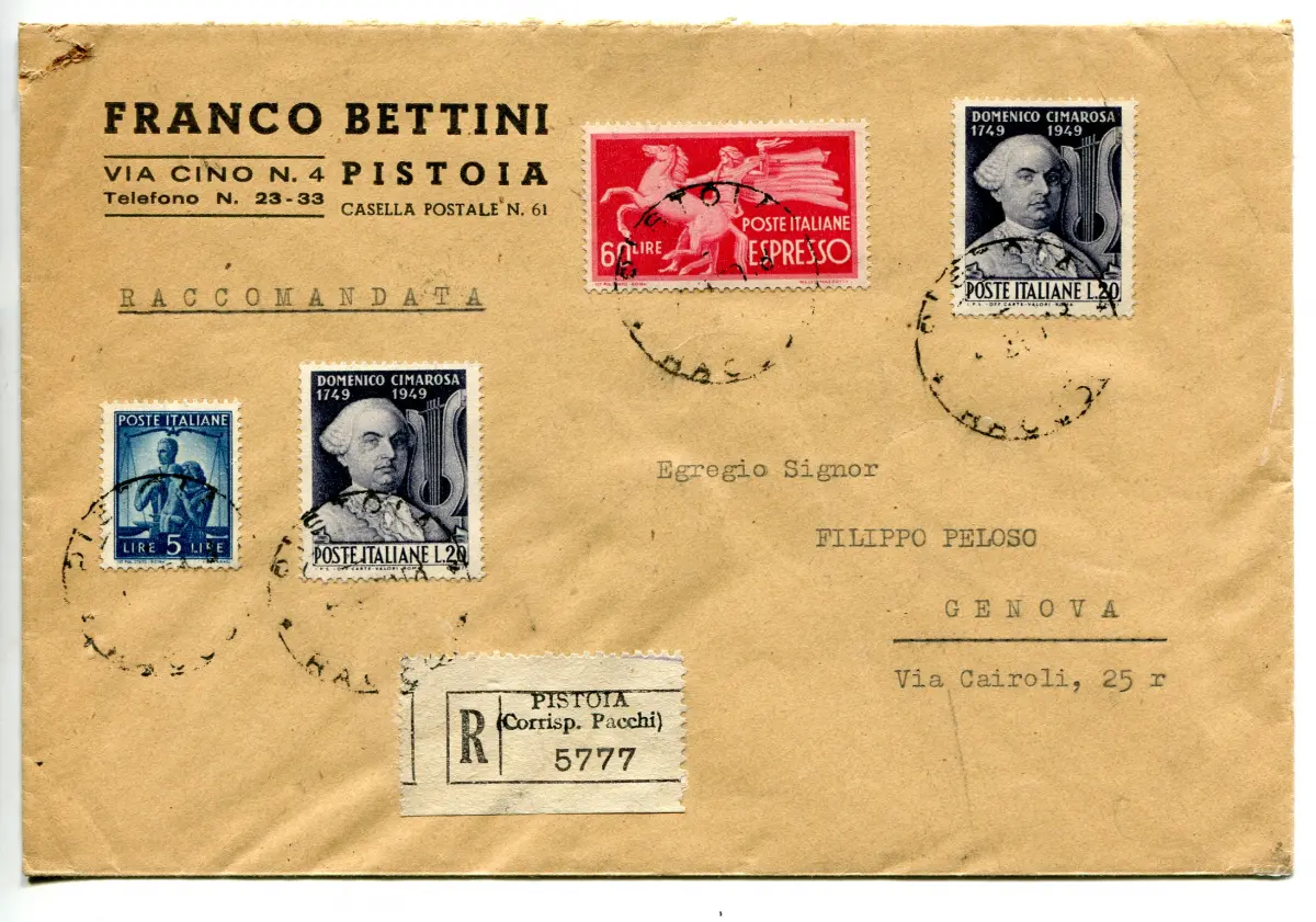 Cimarosa zwei Exemplare auf Expressumschlag Umschlag - Cimarosa Nr. 615 zwei Exemplare + Ergänzungen Nr. 555 + Express Nr. 31 auf Umschlag nach Genua am 6.2.50 - Jahr. abgehend mit dem Datum nicht lesbar, aber abzugsfähig bei Stornierungen auf der Rückseite des Umschlags (Beib. und Ankunft) Cod. 265/13