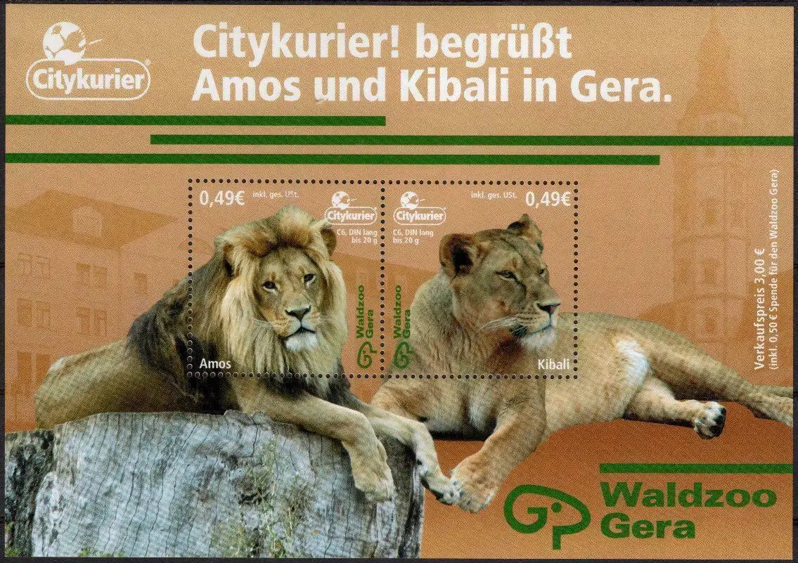 • MichSeite Citykurier: MiNr. 79 - 80 Block 4, 11.08.2011, "Waldzoo Gera: Löwenpaar", Block, postfrisch Beschreibung \nAusgabeland: Bundesrepublik Deutschland \nPostdienstleister: Citykurier, Gera \nAusgabeanlass: Briefmarkenausgabe "Waldzoo Gera: Löwenpaar" Katalognummer: MiNr. 79 - 80 Block 4 Ausgabedatum: 11.08.2011 Nominale: Satz (2 Werte, Block) zu 0,49 EUR (2 x) \nTyp: - \nErhaltung: naßklebend, gezähnt, postfrisch \nHinweis: Verkaufspreis des Herausgebers: 3,00 EUR