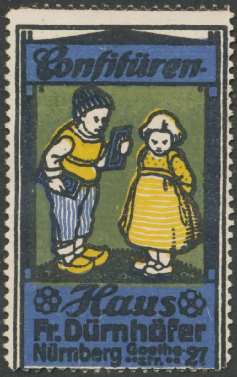 Konfitüre, Kinder, Goethestraße 27, Größe/Zustand: 5x3 , guter Zustand, Original alte Reklamemarke die seinerzeit für die Werbung benutzt wurde