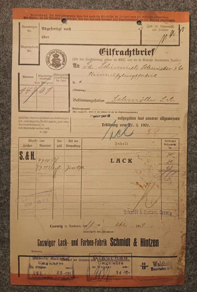 Originaler Frachtbrief, 1919.