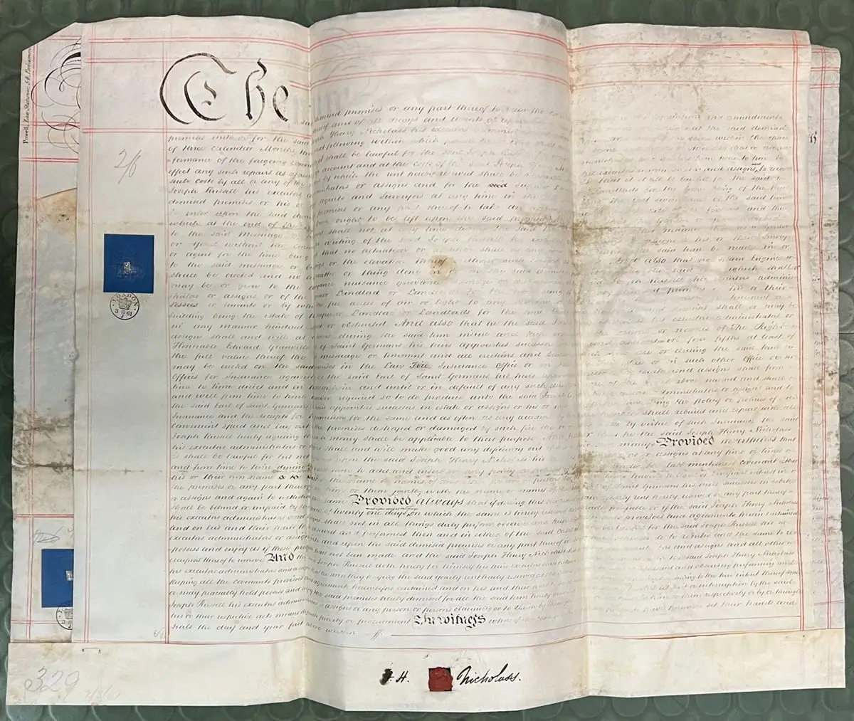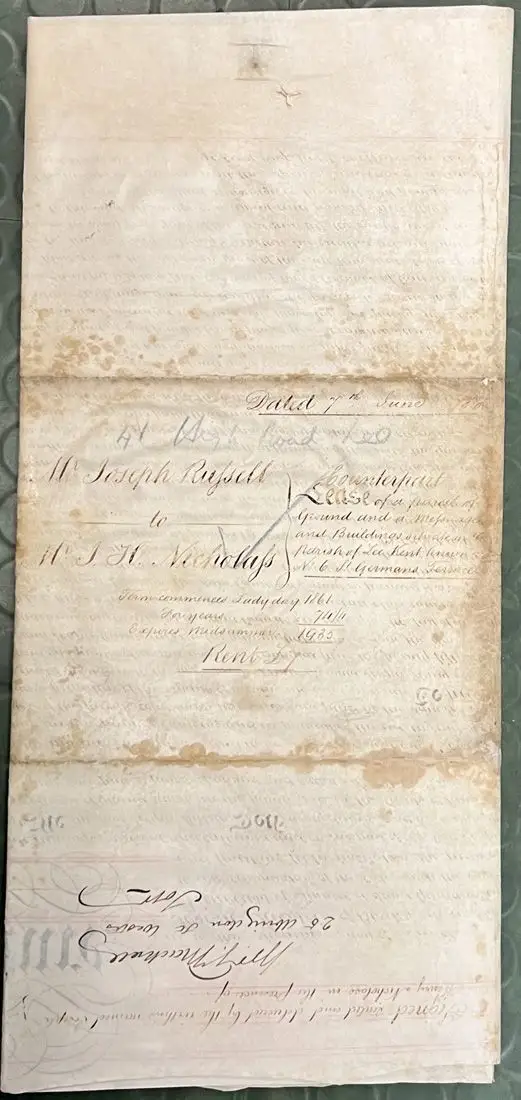 Bemerkungen: Sogenannte Counterpart-Lease-Urkunde, die vom Mieter an den Vermieter ausgestellt wurde. Vermietet wurde ein Grundstück in der damaligen "N. 6 St. Germans Terrace", Lewisham (heute Stadtteil von London). Auf der Versoseite mit kurzem Exzerpt, diese mit blauem Stift später überschrieben "41 High Road Lee" Vermutlich handelt es sich bei dem Grundstück um die heutige Adresse " 41 Lee High Road" (London). Der Vertrag wurde auf eine Laufzeit 74 Jahren zwischen Joseph Russell "of Blackheath" und Joseph Henry Nicholass "of Number 4 Staint Germans Terrace Lee in Kent, Gentleman" abgeschlossen. Am unteren Rand mit der eigenh. Signatur Nicholass` und seinem roten Wachssiegel. Der kolorierte Grundrissplan zeigt das Grundstück zwischen der zeitgenössischen "High Road to Maidstone" und einer "Private Road". Joseph Russell ist über den Katalog der Lewisham Archives nachweisbar und tritt dort in mehreren Verträgen als Bauunternehmer auf. So mietet er in den 1860er- Jahren mehrere Grundstücke an der St. Stephens Terrace an. Auf jenen Grundstücken wurden dann Wohnbauprojekte für Händler, Handwerker und Arbeiter realisiert.