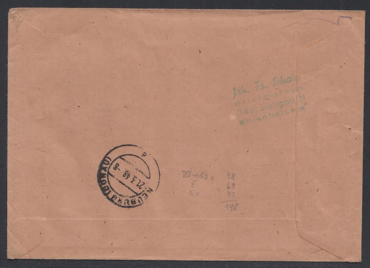 Deutschland All.Bes.,Gemeinschaftsausgaben, Mi.Nr. 967 Leipziger Frühjahrsmesse 1948 u. 959 auf Brief per Einschreiben und Nachnahme (Inhalt: Briefmarken eines Markenhändlers!), Porto 148 Pf., also 2 Pf. zu viel, Erhaltung siehe Scan
