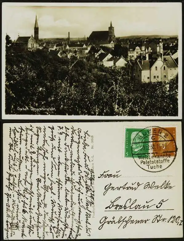 3 Pfg + 5 Pfg Wert aus der Freimarkenausgabe Ebert und Hindenburg auf Ansichtskarte mit Ansicht von GUBEN, aufgegeben in GUBEN