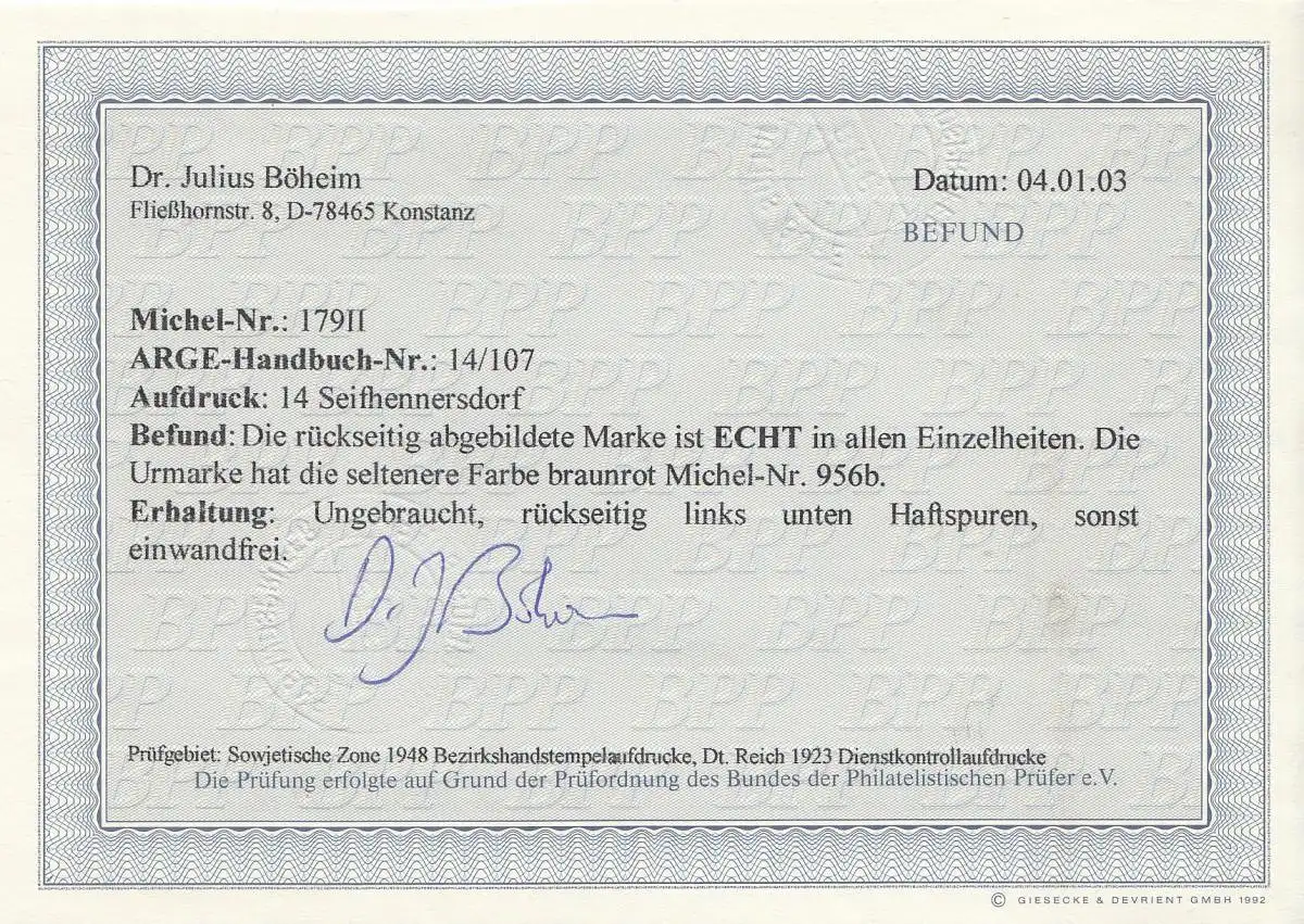 SBZ MiNr. 179 II, ungebraucht, geprüft "Böheim BPP", Erhaltung siehe Scan