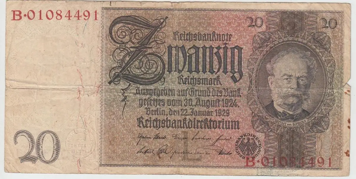 (D1124) Geldschein Reichsbanknote, 20 Mark 1929