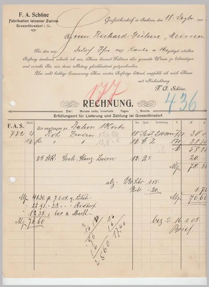 (D131) 2 Stück Rechnung Fa. F.A.Schöne, Großröhrsdorf (Sa.) 1907