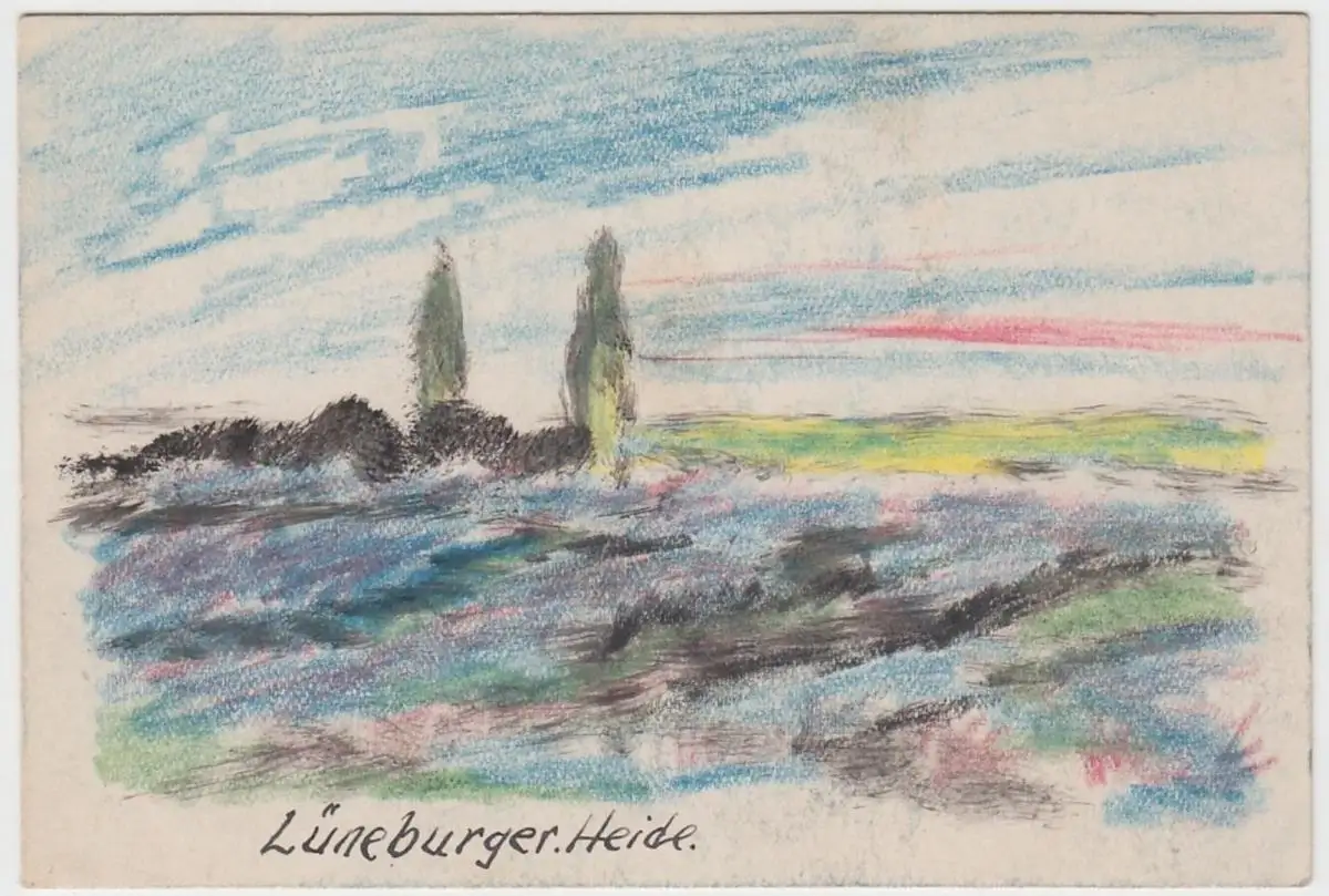 - (D493) Lüneburger Heide, Original Gemälde m. Tusche u. Wachsmalstift