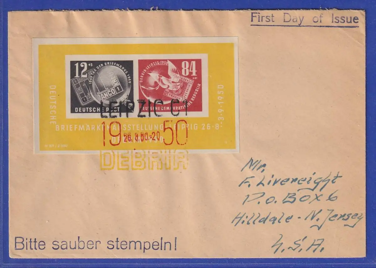 DDR 1950 DEBRIA-Block auf FDC, adressiert in die USA