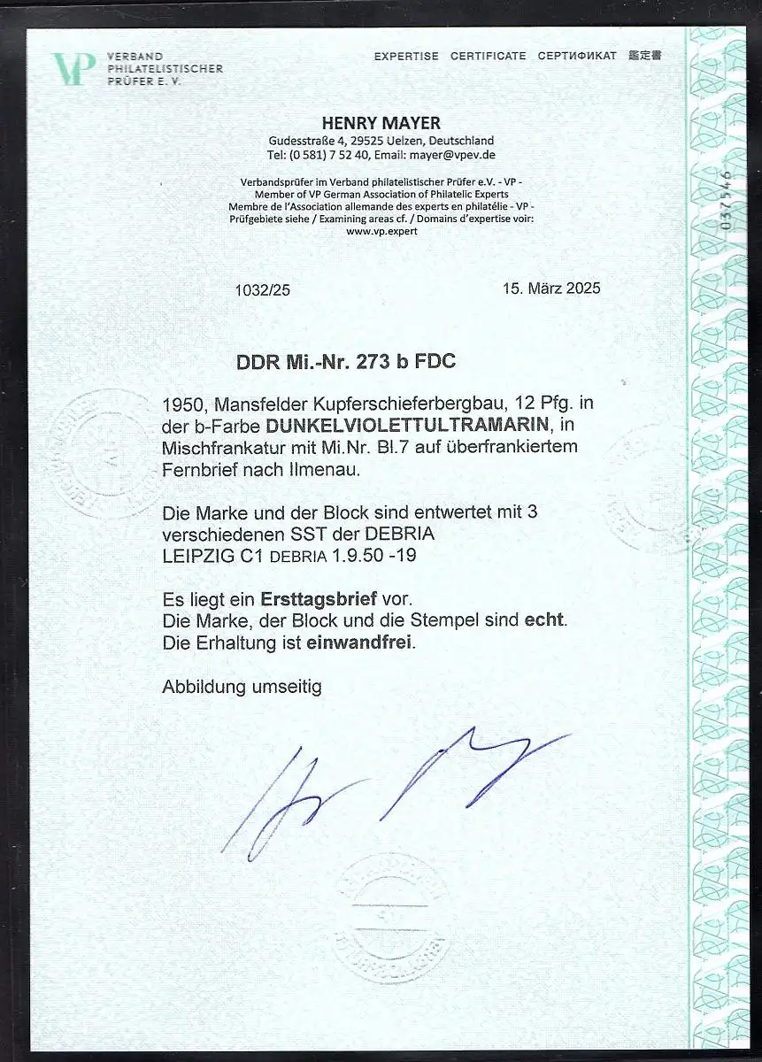 DDR. 1950 FDC. Mi.-Nr. 273 b