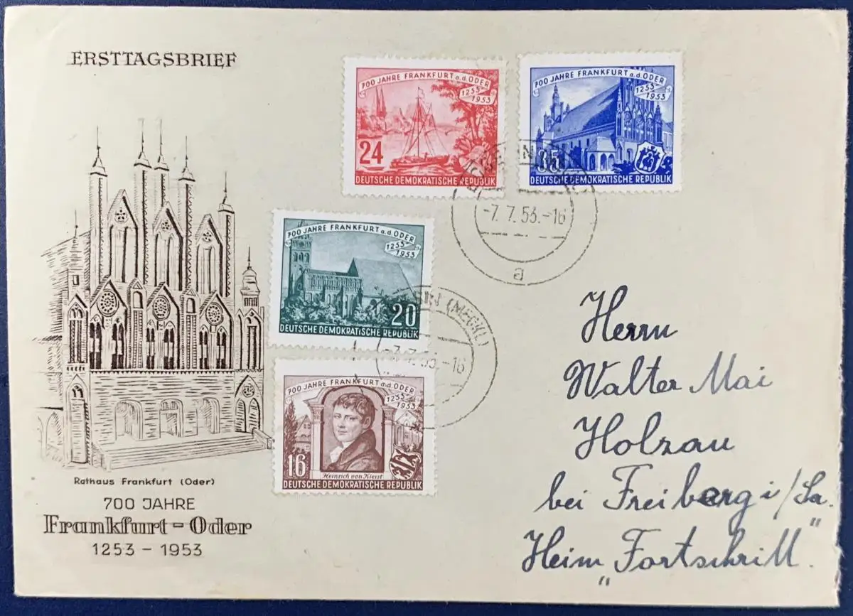 Satzbrief, frankiert mit Mi.Nr. 358-361, gelaufen mit Poststempel vom 07.07.1953 von Eggesin nach Holzau bei Freiberg/Sachsen (KEIN Ersttagsdatum), Brief ist sehr gut erhalten.