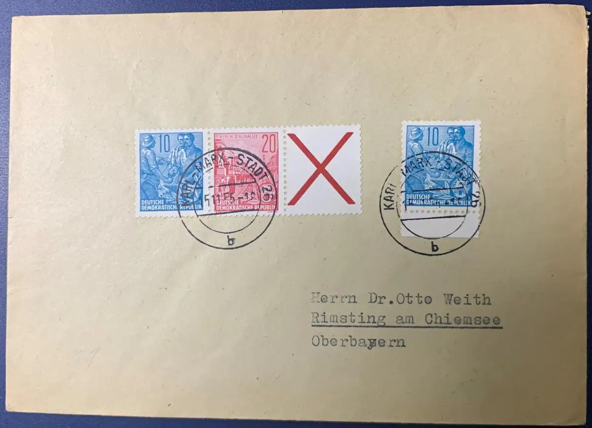 Bedarfsbrief in die BRD, frankiert mit einem waagerechten Zusammendruck aus MHB1 (Mi.Nr. 453 + 370+ X) und Mi.Nr. 453 mit Unterrand, gelaufen mit Poststempel vom 15.11.1955 von Karl-Marx-Stadt nach Rimsting am Chiemsee, Brief ist sehr gut erhalten.