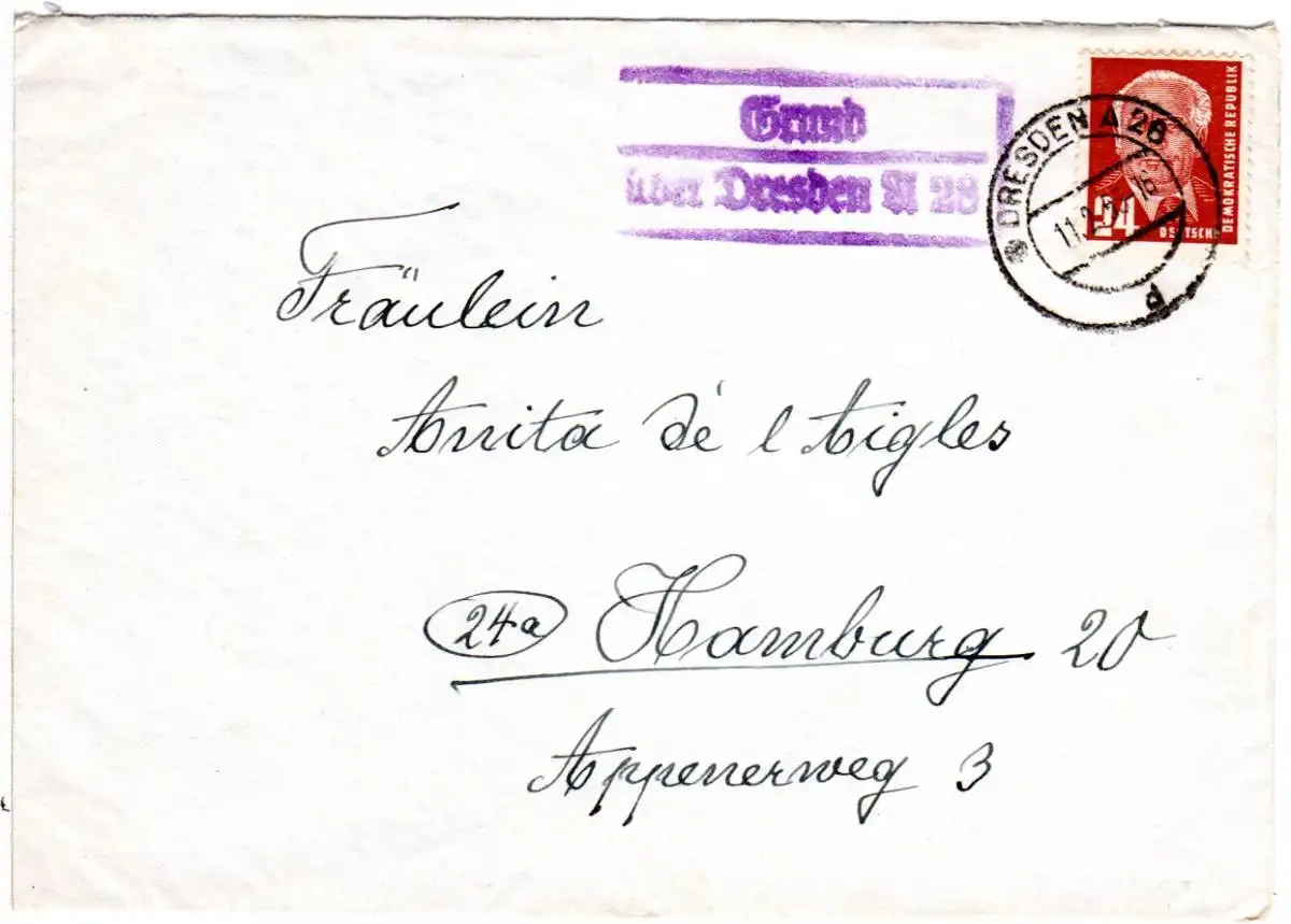 DDR 1956, Landpost Stpl. GRUND über Dresden A28 auf Brief m. 20 Pf.