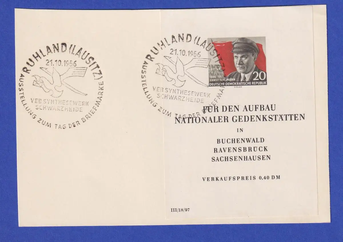 DDR 1956 Thälmann-Block mit PLF "roter Strich" auf Karte, So.-O RUHLAND