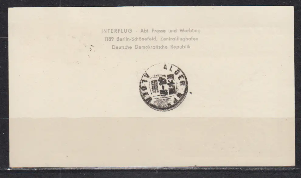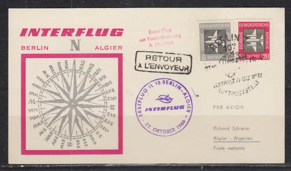 INTERFLUG-Karte Berlin-Algier " Erster Flug mit Postbeförderung 3.11.66" , Vordruckkarte mit allen Flugpost-o