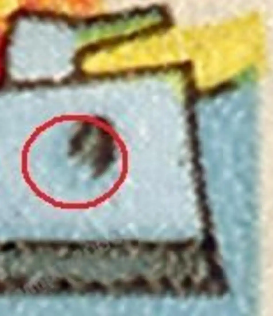 Im ersten Bild sehen Sie eine vergrößterte Beispielabbildung des Fehlers, im zweiten Bild die zu ersteigernde Briefmarke