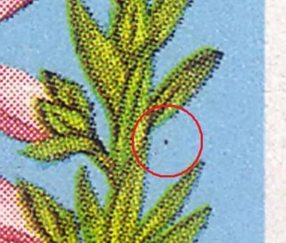 Im ersten Bild sehen Sie eine vergrößterte Beispielabbildung des Fehlers, im zweiten Bild die zu ersteigernde Briefmarke