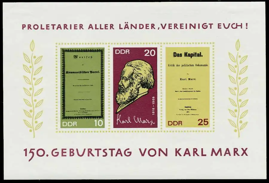 Block-Ausgabe 150. Geburtstag von Karl Marx, Im Blockrand kleine Mängel, Marken und Zusammendrucke einwandfrei
