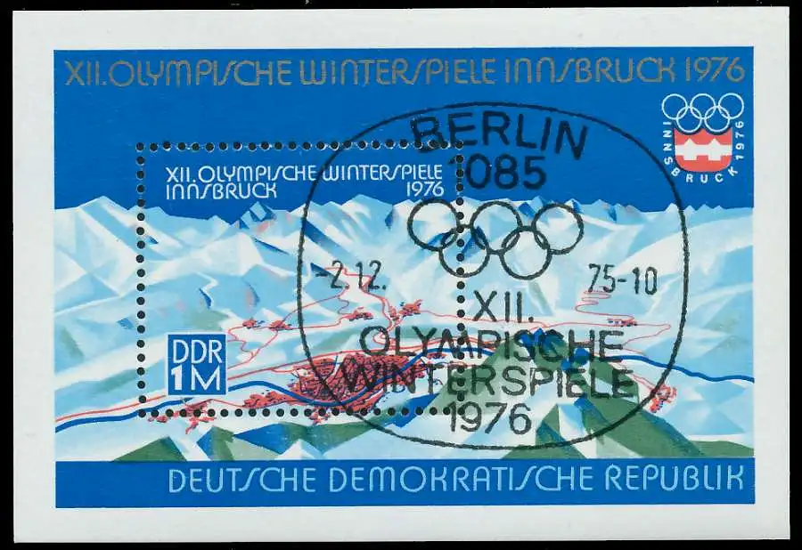 Block-Ausgabe Olympische Winterspiele 1975 in Innsbruck, mit Sonderstempel