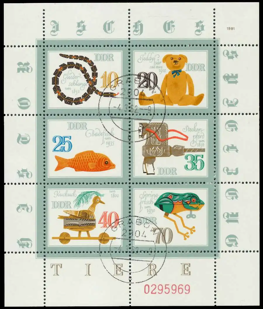 Kleinbogen-Ausgabe Historisches Spielzeug, oben nicht durchgezähnt (MichelNr.: 2661, 2662, 2663, 2664, 2665, 2666)