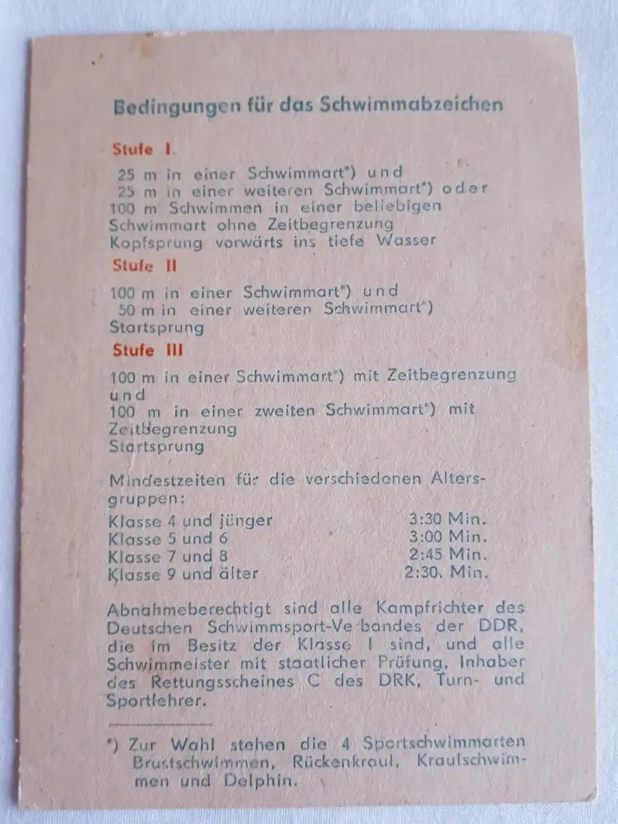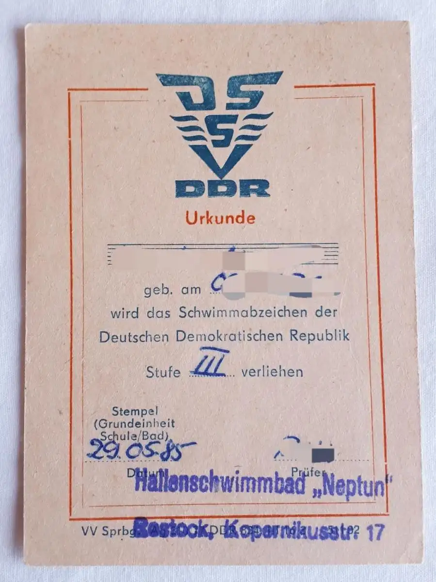 DDR DSSV Urkunde Schwimmabzeichen Stufe III