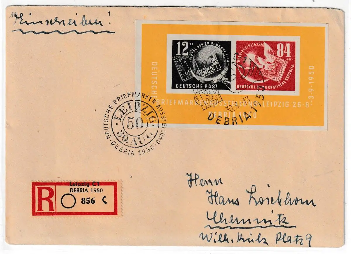 DDR Debria-Block auf Einschreib-Brief, 2 versch. Sonderstempel