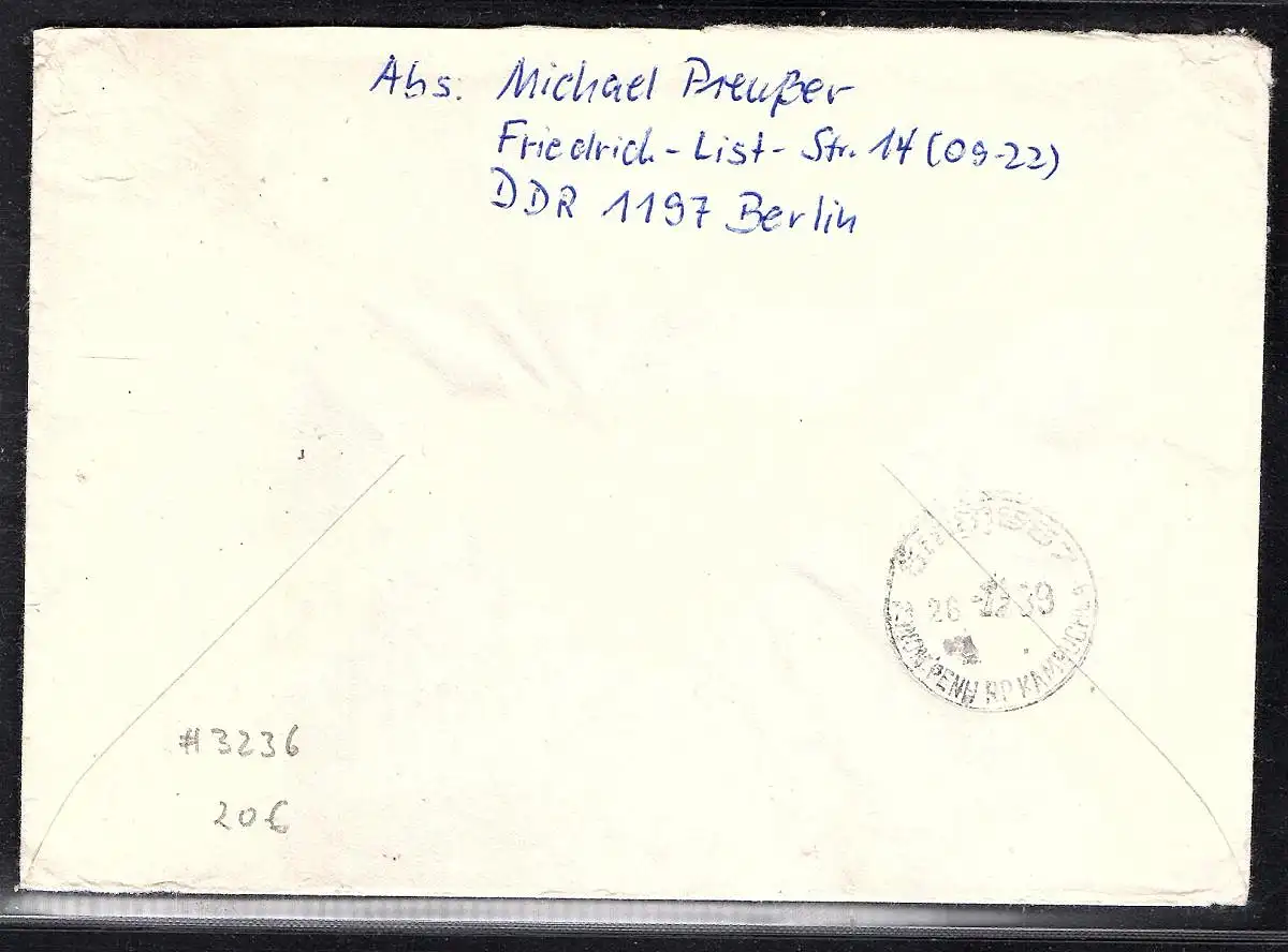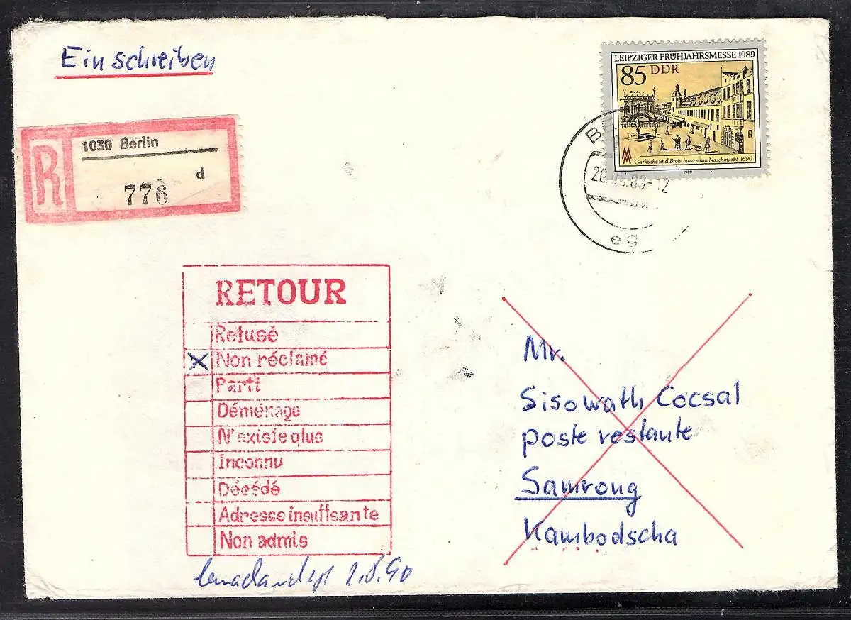 DDR. EF. Mi.-Nr. 3236 auf R.-Auslandbrief nach Kambodscha mit Ak.-St.