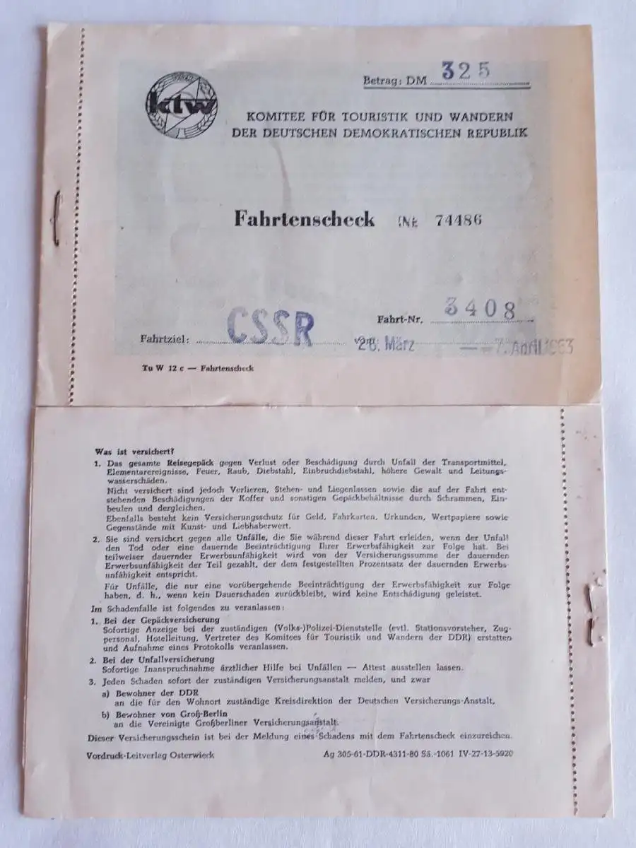 DDR KTW Komitee für Touristik und Wandern Fahrtenscheck Fahrtziel CSSR 1963 R.
