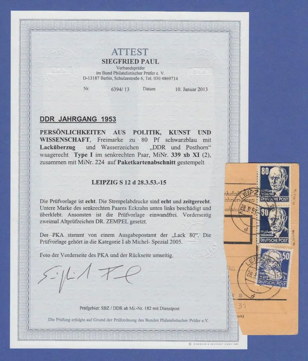DDR Köpfe II 80 Pfg LACKMARKE, 2 Stück auf Paketkartenabschnitt, Attest Paul BPP