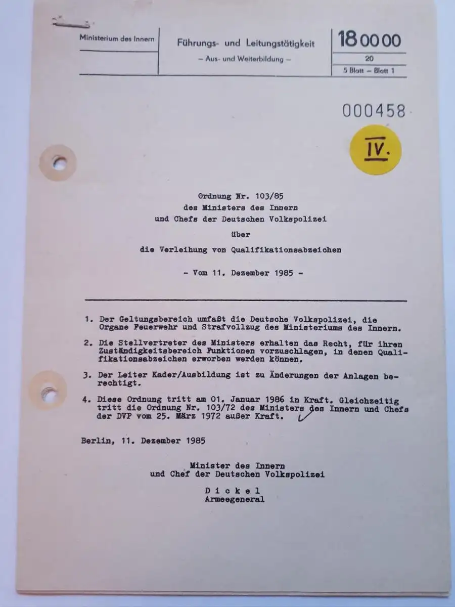 DDR MdI Ordnung Nr.103/85 Verleihung von Qualifikationsabzeichen