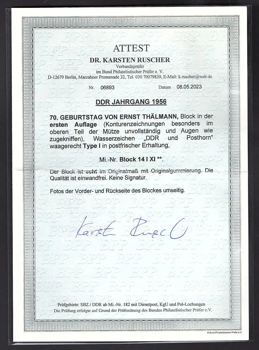DDR. Mi.-Nr. Block 14 I postfrisch, FA. DR. Ruscher.