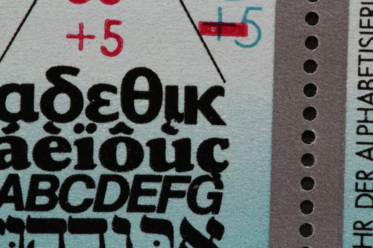 Alphabetisierung, Plattenfehler: rechtes Schriftzeichen der oberen Zeile beschädigt.