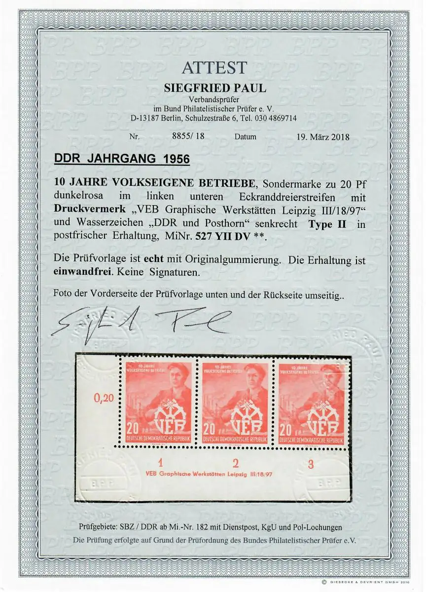 DDR MiNr. 527 YII DV, postfrisch, **, Eckrand E3, Type II mit BPP Attest