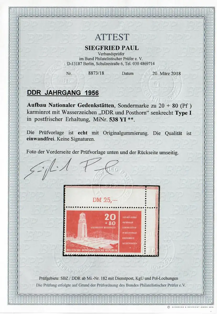 DDR MiNr. 538 YI, postfrisch, **, Eckrand E2, Type I mit BPP Attest