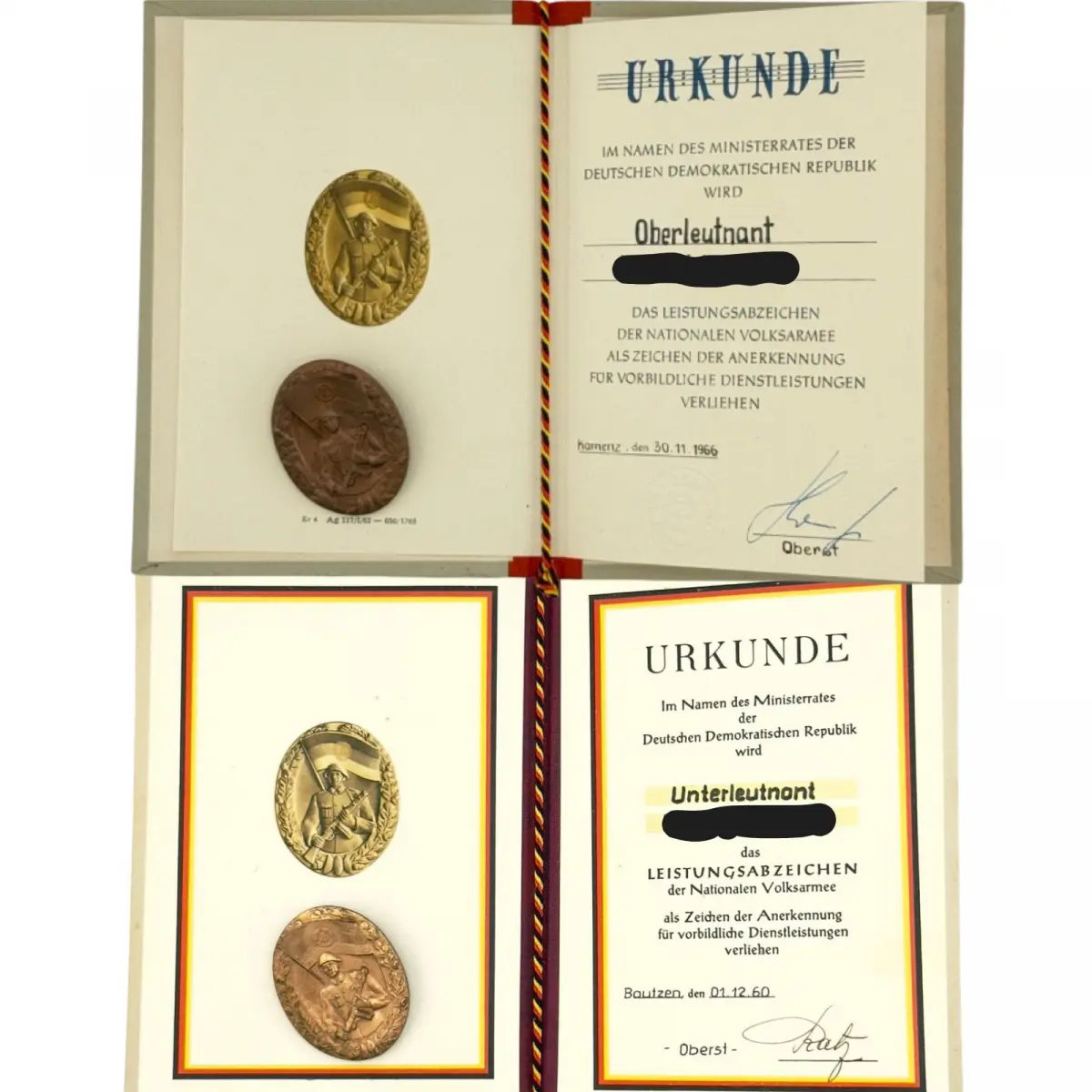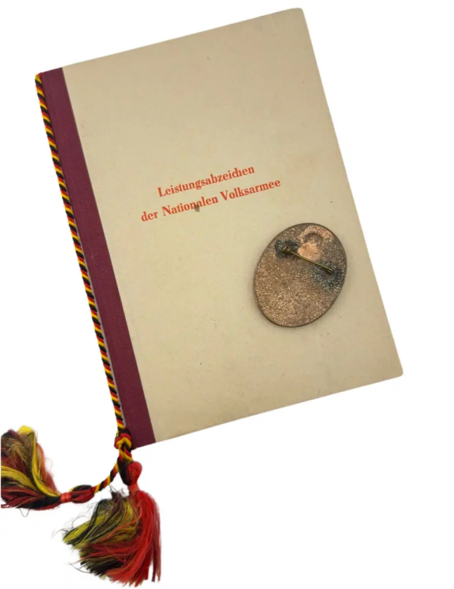 Leistungsabzeichen der NVA 1960 mit Urkunde (Variante: nachträglich eingeschlagenes Wappen ohne Verleihungsnummer)
