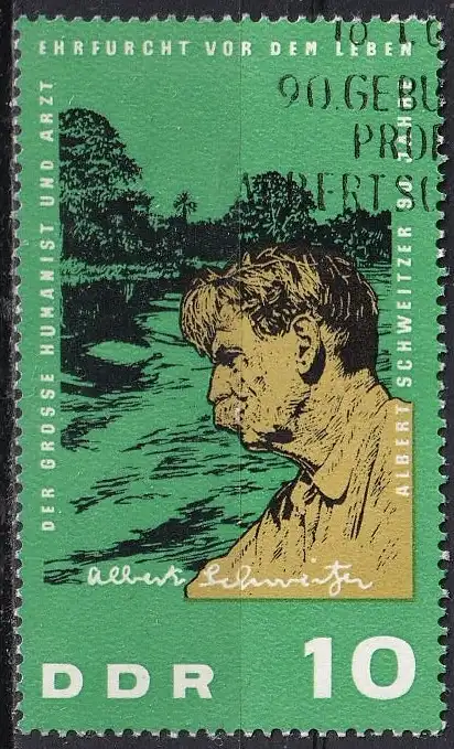 90. Geburtstag von Dr. Albert Schweitzer: Dr. A. Schweitzer (1875-1965), elsäss. Missionsarzt, evang. Theologe, Musiker, Friedens-Nobelpreis 1952; Urwaldlandschaft; Namenszug von Dr. A. Schweitzer