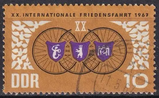 Internationale Radfernfahrt für den Frieden Warschau - Berlin - Prag: Stadtwappen von Warschau, Berlin und Prag, Räder, stilisierte Tauben