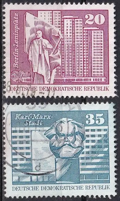 Aufbau in der DDR. Großformat 29×24 mm (I): Lenindenkmal, Wohnhochhaus, Berlin / Karl-Marx-Monument vor Neubauten, Chemnitz (Karl-Marx-Stadt)