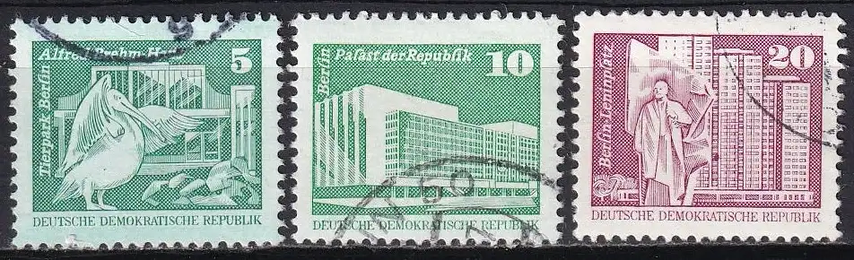 Aufbau in der DDR. Kleinformat 21,5×17,5 mm (V): Pelikan; Alfred-Brehm-Haus, Tierpark Berlin / Palast der Republik, Berlin / Lenindenkmal, Wohnhochhaus, Berlin