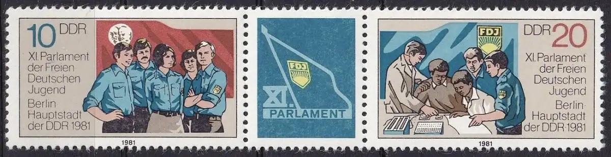 Parlament der Freien Deutschen Jugend (FDJ), Berlin: Mitglieder der FDJ, Fahne mit den Bildnissen von Thälmann und Pieck / Zierfeld / Mitglieder der FDJ und ausländische Jugendliche bei der Berufsausbildung, FDJ-Fahne